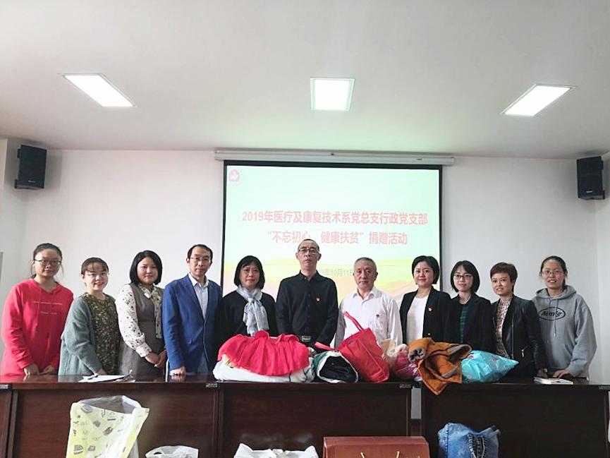 为响应省卫健委的号召,扎实开展2019年扶贫日自愿捐赠活动,医疗技术系、康复技术系党总支部于10月11日,在龙泉校区开展了以“不忘初心,健康扶贫”为主题的捐赠活动,学院副院长赵斌作为联系系部领导参加本次活动。