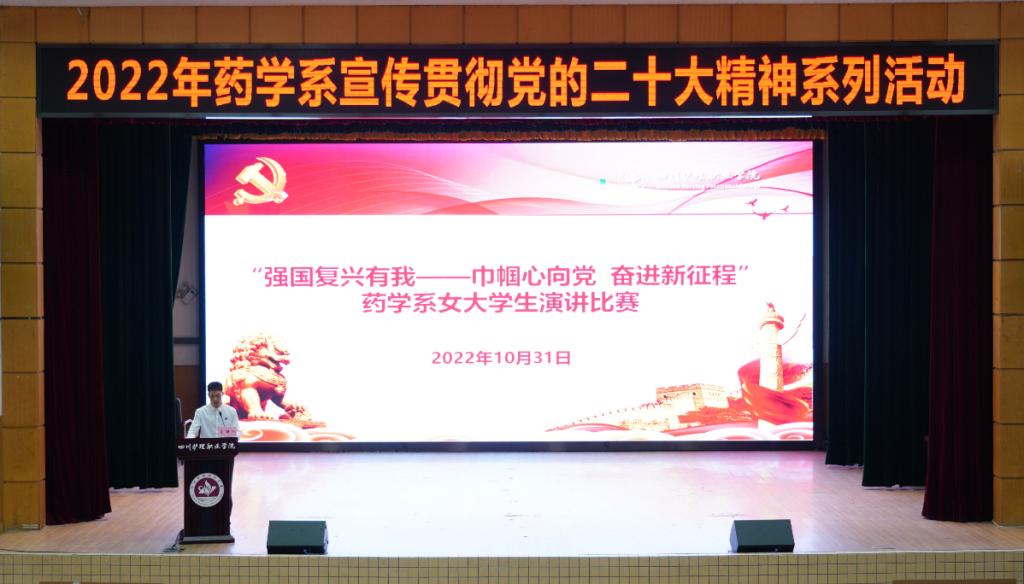 10月31日,药学系在成都校区举行2022年宣传贯彻党的二十大精神系列活动之“强国复兴有我—巾帼心向党 奋斗新征程”女大学生演讲比赛。