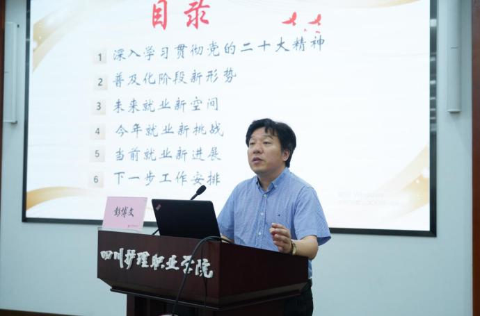彭博文结合习近平总书记对就业工作的重要指示和学院工作实际,从党的二十大精神、普及化阶段新形势、未来就业新空间、今年就业新挑战、当前就业新进展、下一步工作安排等几个方面全面分析解读了当前就业形势与就业政策,为大家上了一堂系统深刻、具有丰富实践性的专题党课。